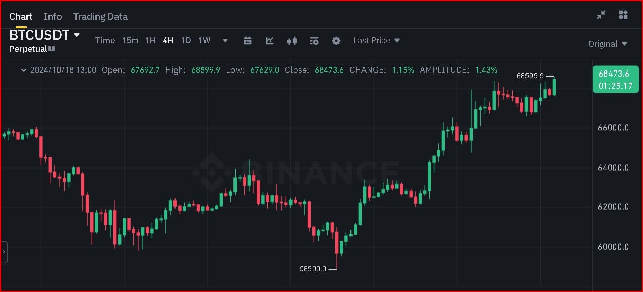 For example; as you can see on the candlesticks price chart data, right now the latest 4 hours candlestick of the BTC-USDT Cryprocurrency is still green at above the 2nd hour of the candlestick price session!