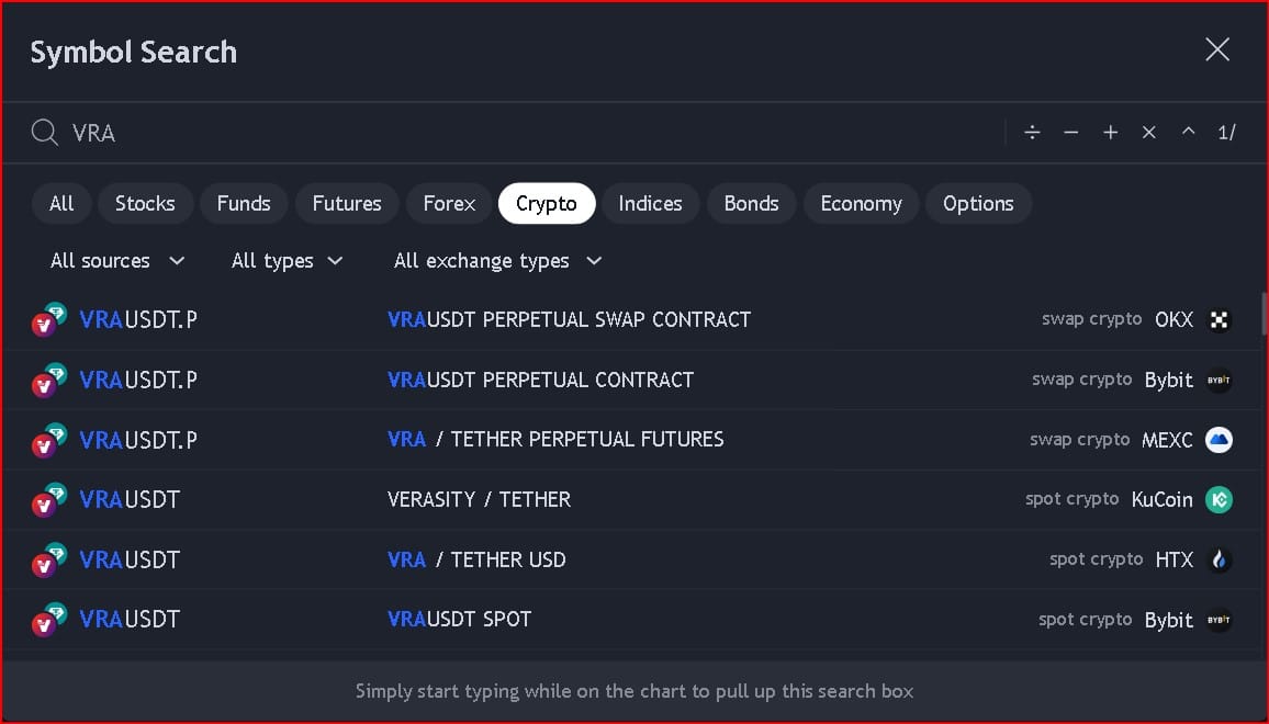 So open your Tradingview Desktop app, click on the search Ticker bar, and type in the Crypto ticker symbol from our blog post and select the BYBIT Cryptocurrency Exchange.