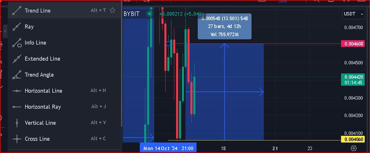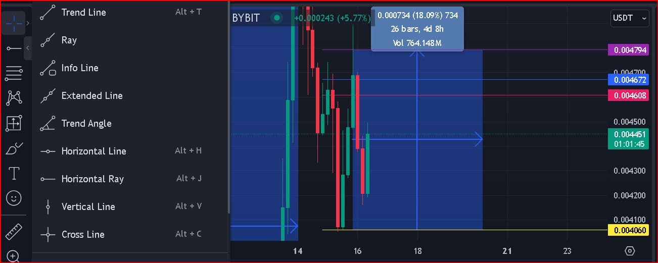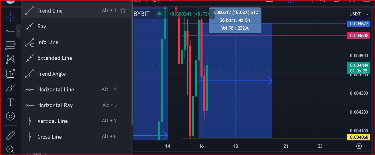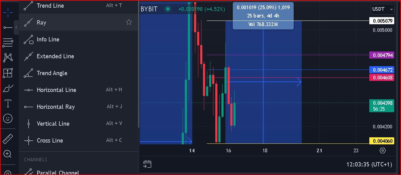 Now click on the Trend Line Tools again and select the Horizontal Ray Tool, drag the line to the exact Entry Price of the Crypto trading signal and then change the colour to Blue.
