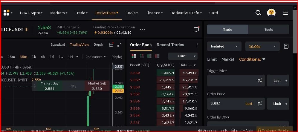 Action #3: Open your BYBIT app, click on the Derivatives link and then click on the Trade Tab, search for the Crypto Ticker Symbol indicated in your Crypto trading signal.