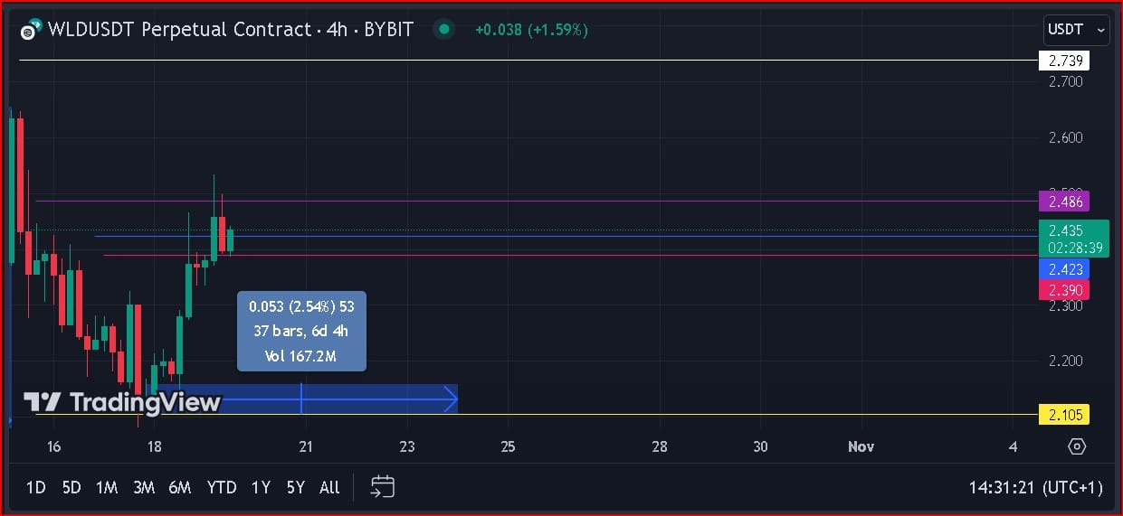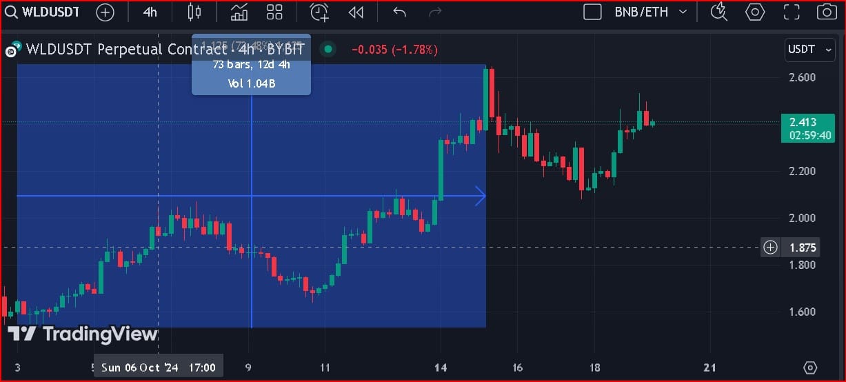 Based on the raw price data pulled from the candlesticks price chart data of the WLD-USDT Cryptocurrency Futures contract.